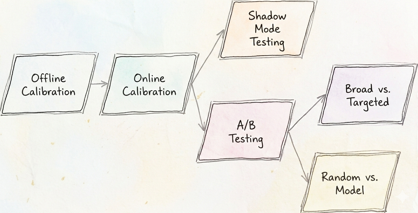 Before a model ever touches a real user, it must pass through Offline Calibration. Using historical datasets, the development team stress-tests the model’s logic to ensure it meets minimum performance thresholds.