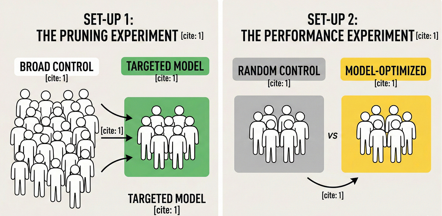 The Logic: The Control group offers the discount to everyone, while the Model identifies organic buyers (those who would buy without an incentive) and prunes them out of the Test group.