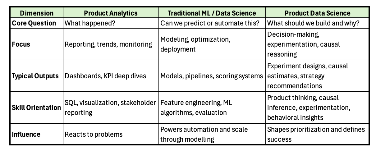 Product Data Science focuses on user behavior, and understanding business strategy with experimentation and causal inference as core tools to uncover what actually drives outcomes.