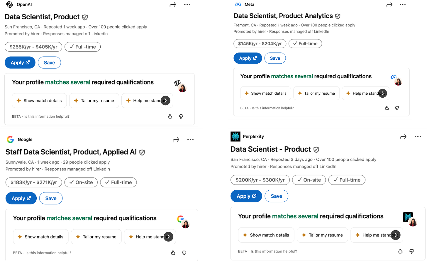 (For reference, below is a snapshot of open Product Data Science roles across top tech and AI first companies.)