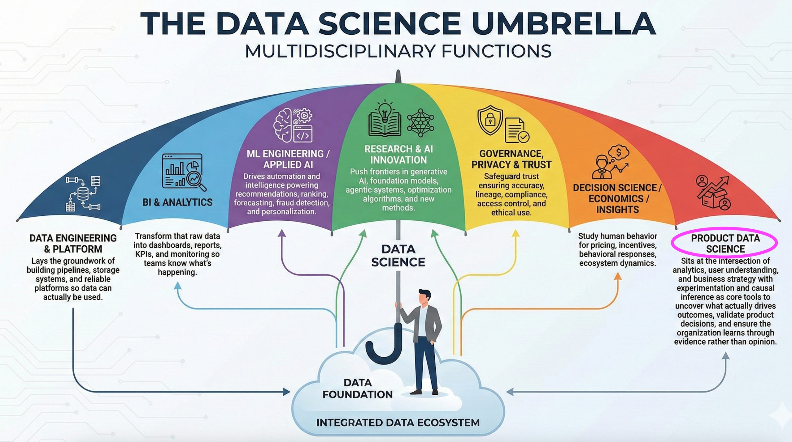 Product Data Science sits squarely within Data Science - shaping what gets built, why it matters, and how success is validated